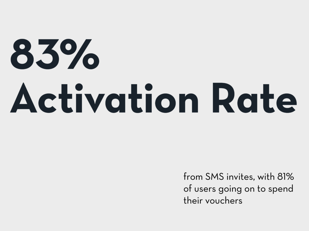 Of the 600 digital vouchers available, 515 were distributed, with an impressive 83% activation rate (recipients downloaded the app via SMS). Among those, 81% went on to spend their funds, proving the concept’s power to convert curiosity into tangible retail activity.