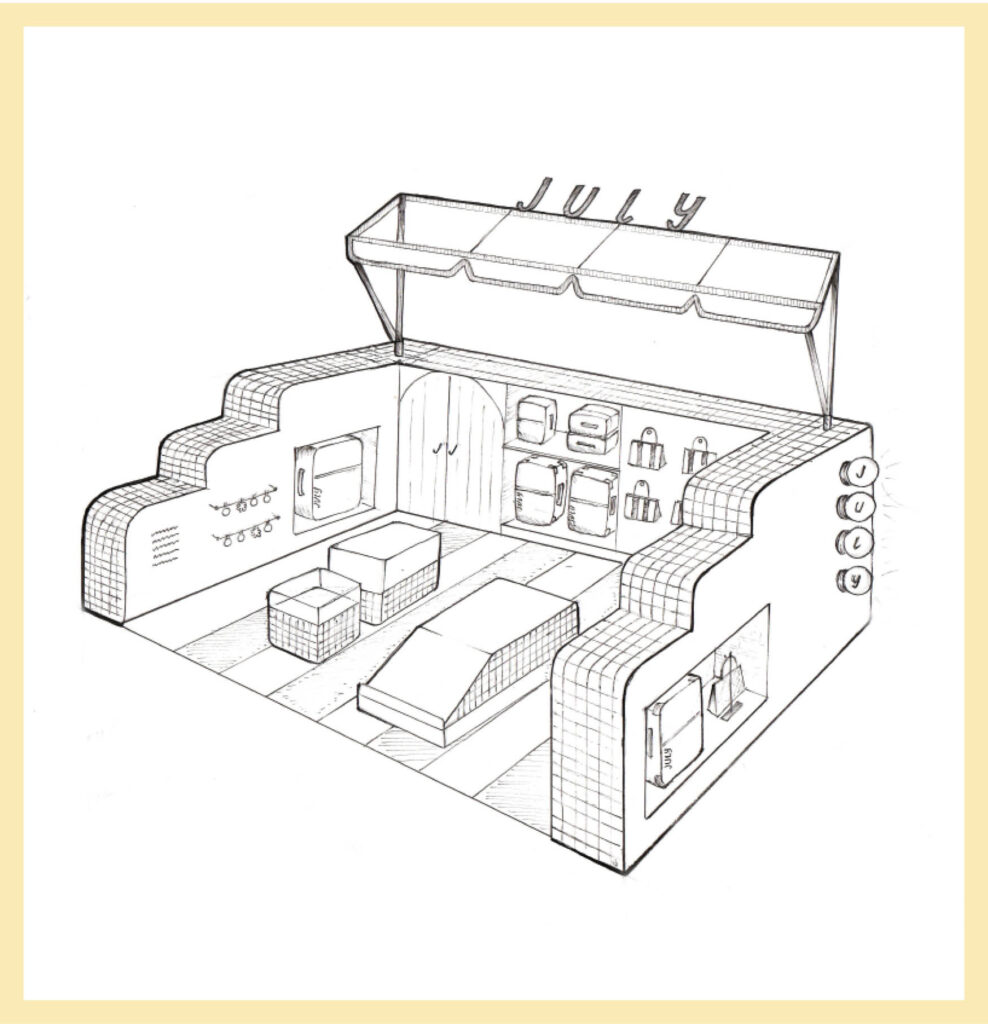 To celebrate the golden age of travel, we partnered with July to design, build, and install a bespoke six-month activation within Sydney Airport’s International Terminal. Drawing inspiration from 20th-century travel posters and the iconic beach club culture of the time on the Australian coast, the pop-up features a warm, buttery colour palette that captures the essence of a perpetual summer. Every material was deliberately selected to align with July’s brand aesthetic, creating an inviting environment that entices travellers to explore the collection while navigating the bustling terminal.